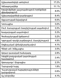 Անշուշտ, անհերքելի է այն փաստը, որ մեր երկրում կարգ ու կանոնի հաստատման պահանջը զգալի է: Սակայն հետազոտության ընթացքում փորձ է արվել պարզել նաեւ երկրի առջեւ ծառացած կարեւոր խնդիրները, որոնք առաջնահերթ լուծում են պահանջում: Ստացված պատասխանները ներկայացված են հետեւյալ հիմնական խմբերով`